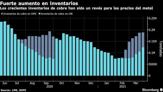 Las existencias en las bodegas que siguen las bolsas en Londres y Shanghái han aumentado en las últimas semanas, lo que ayuda a aliviar las preocupaciones sobre la escasez de suministros. Los inventarios que monitorea la Bolsa de Metales de Londres se han expandido más del doble desde fines de febrero. Las existencias en la Bolsa de Futuros de Shanghái aumentaron durante nueve semanas consecutivas hasta principios de abril, en la racha más larga desde el 2014.