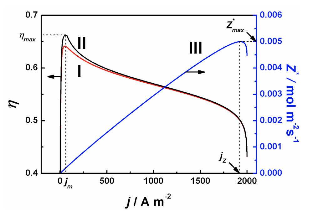 Gráfica que muestra la eficiencia de producción de hidrógeno (eje y) en función de la densidad de corriente (eje x). La función Z es el producto de la eficiencia por la productividad y marca la cantidad de hidrógeno (en la unidad química moles) por metro cuadrado de lámina de electrodo y segundo. Author provided (no reuse)