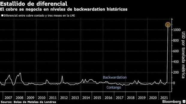 El mercado del cobre de Londres sigue en una contracción histórica, ya que la grave escasez de inventarios disponibles impulsa los precios a niveles casi récord y hace que los compradores paguen enormes primas por el metal al contado.